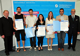 In der Akademie für Unternehmensführung der Handwerkskammer in Würzburg überreichten am vergangenen Freitag Kammer-Präsident Hugo Neugebauer, Regierungspräsident der Regierung von Unterfranken, Dr. Paul Beinhofer, und der Bürgermeister der Stadt Würzburg, Dr. Adolf Bauer, über 180 Diplome der Aufstiegsfortbildungen Betriebswirt/in (HWK), Kaufmännische/r Fachwirt/in (HWK) sowie Betriebsinformatiker/in (HWK) und Wirtschaftsinformatiker/in (HWK) an die erfolgreichen Absolventen.