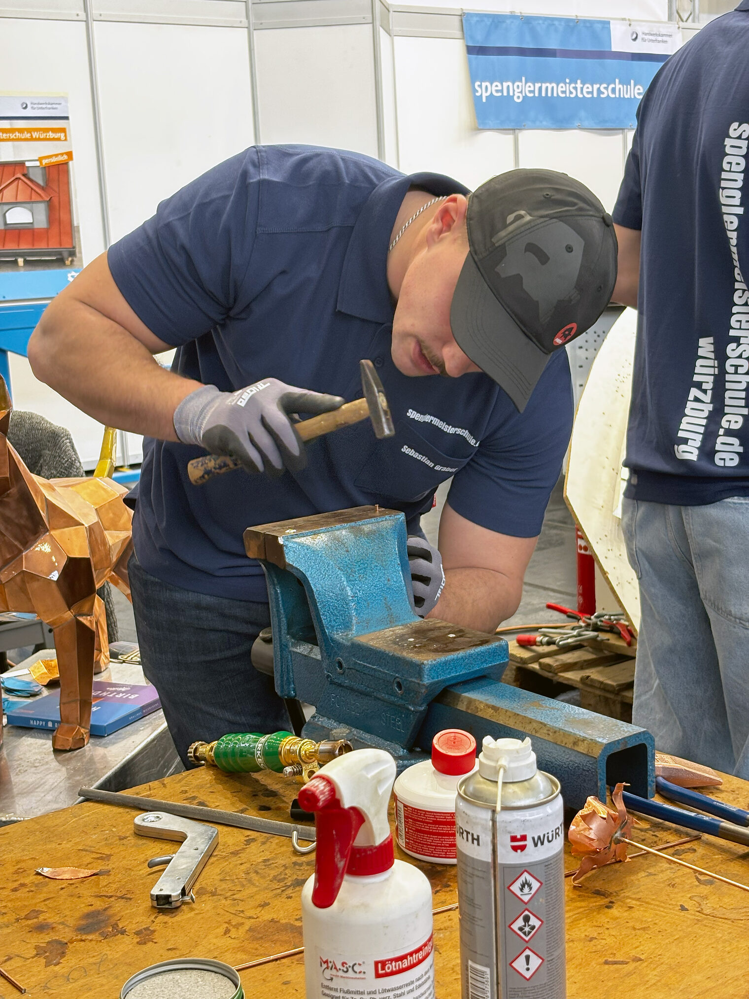Am 1. Messetag, den 24.02.2026, verlieh das Fachmagazin BAUMETALL im Rahmen des Leserwettbewerbs „Meisterstück des Jahres" den Goldenen Hammer – die Prämierung der besten Spenglermeisterstücke aus 2024 und 2025. Vier dieser ausgezeichneten Werke stammten von Meisterschülern der Spenglermeisterschule Würzburg: Luca Schmid mit einem Bierfass mit Zapfanlage, Sales Bär mit einer Blechtrommel, Dennis Gramm mit einem Drachenkopf und Artur Kusmin mit einem Skateboard mit Minirampe.
